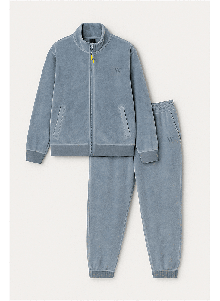 Blauwgrijze set van sweaterstof waarvan de korte jas, twee zakken heeft en de broek touwtjes om ze eventueel aan te spannen.