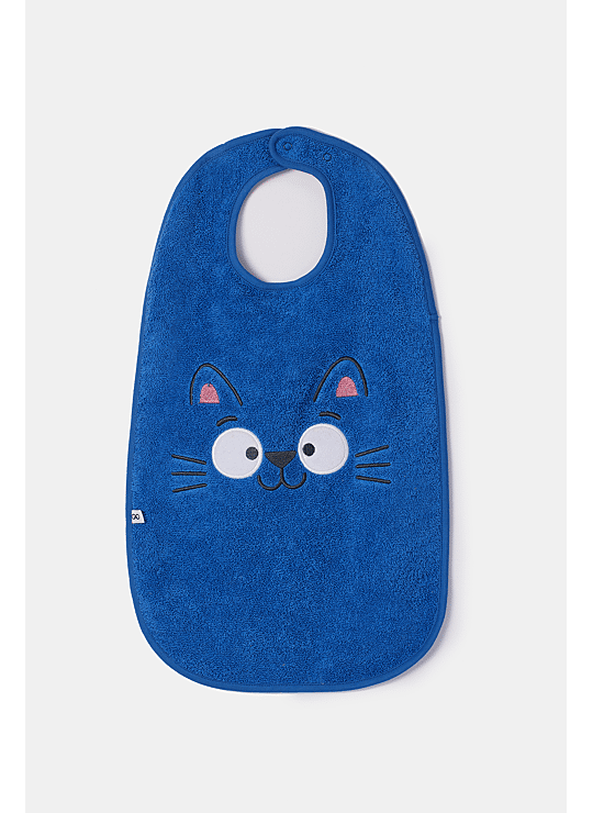 Grote donkerblauwe slab van geweven badstof met kat. De slab meet 30x45 cm en heeft drukknopen voor twee verschillende groottes.